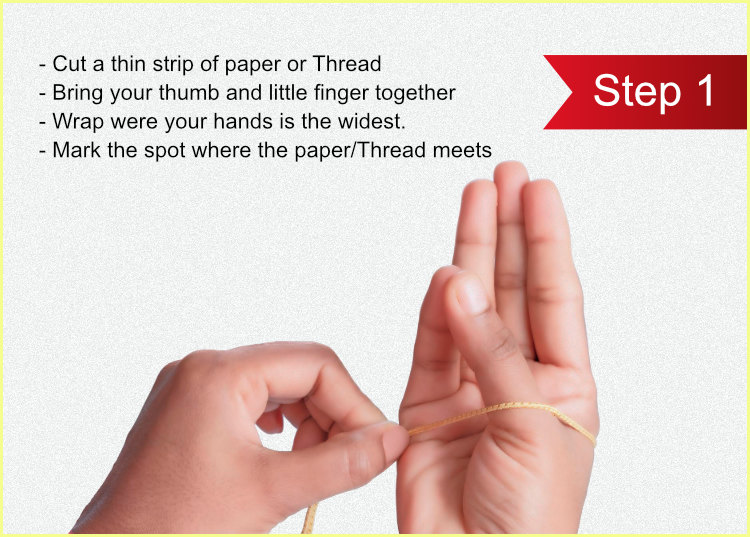 1. This is a chart that will be extremely helpful for you to determine the bangle size that you need. Measure your hand, you will need a measuring tape or a piece of paper and a ruler. Bring your thumb and little finger together and measure were your hand is the widest as shown in the picture.