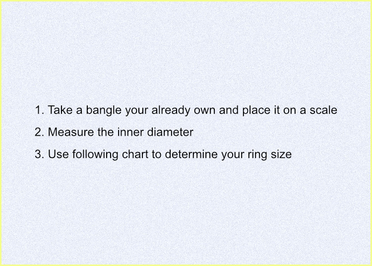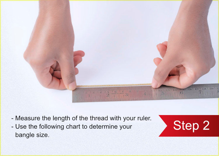 2. Here is another chart that can also be considered in determining the appropriate bangle size. Measure the inside diameter of a bangle that you already own. It measures inside the diameter of such bangle in millimeters. This is normally used for double checking your results from the usual paper method. Apart from this, you can also make use of the bangle that you wear daily and cross check the same with below chart.